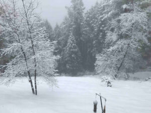 Hemos estado experimentando nevadas históricas en el norte de California. Por difícil que sea de imaginar, algunas áreas cerca del lago Tahoe han tenido casi cincuenta pies de nieve hasta ahora, ¡y más en camino! Mucho menos ha caído en Ananda Village, pero aún así hemos obtenido más que en cualquier otro momento en la memoria reciente. Con colinas, temperaturas bajo cero y caminos nevados, muchos de nosotros hemos estado atrapados por la nieve. Aquí está la vista desde nuestra sala de estar esta mañana.